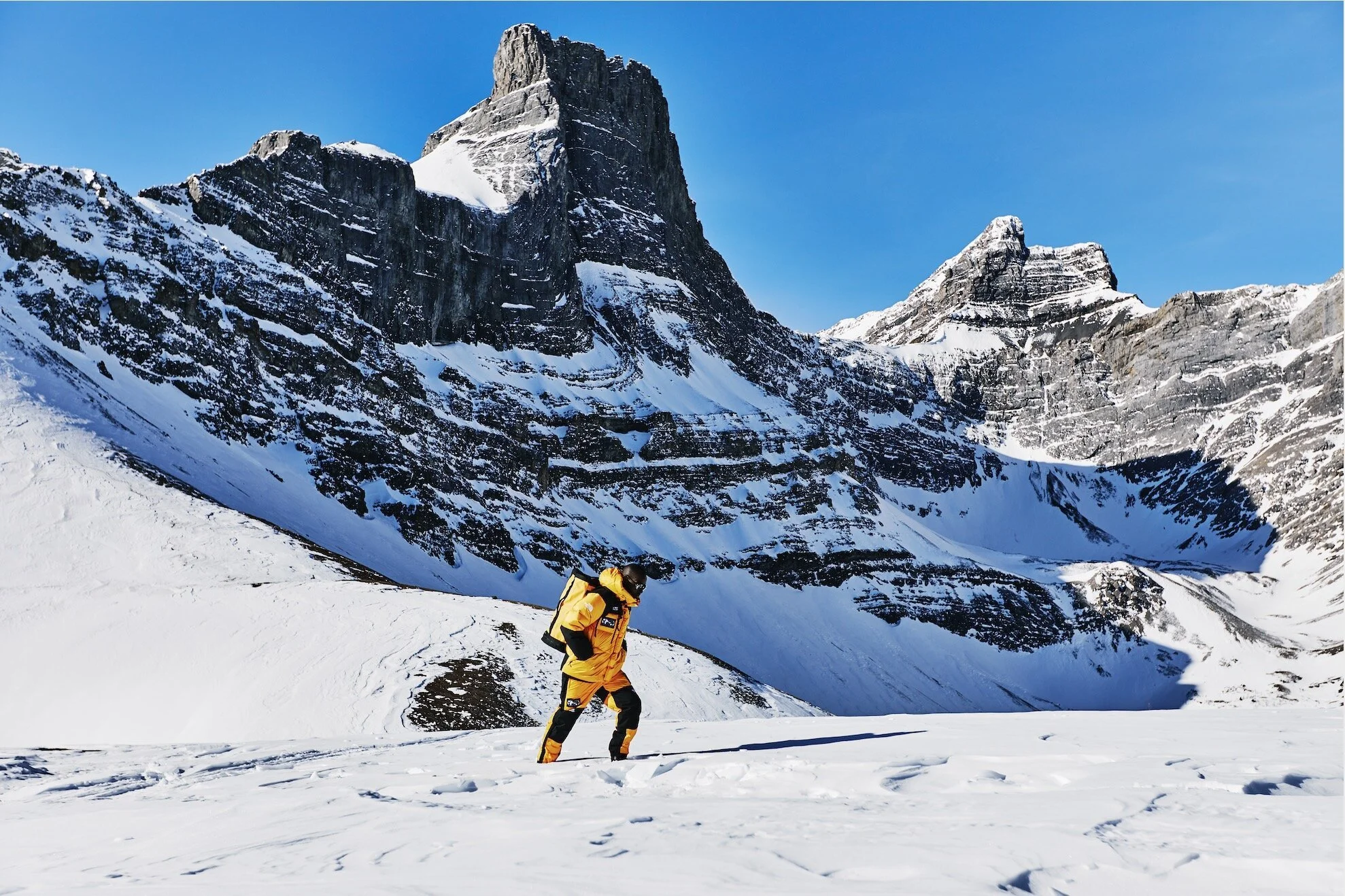 A person dressed in yellow winter gear hiking in snowy terrain with rugged snow-capped mountains and a clear blue sky in the background.