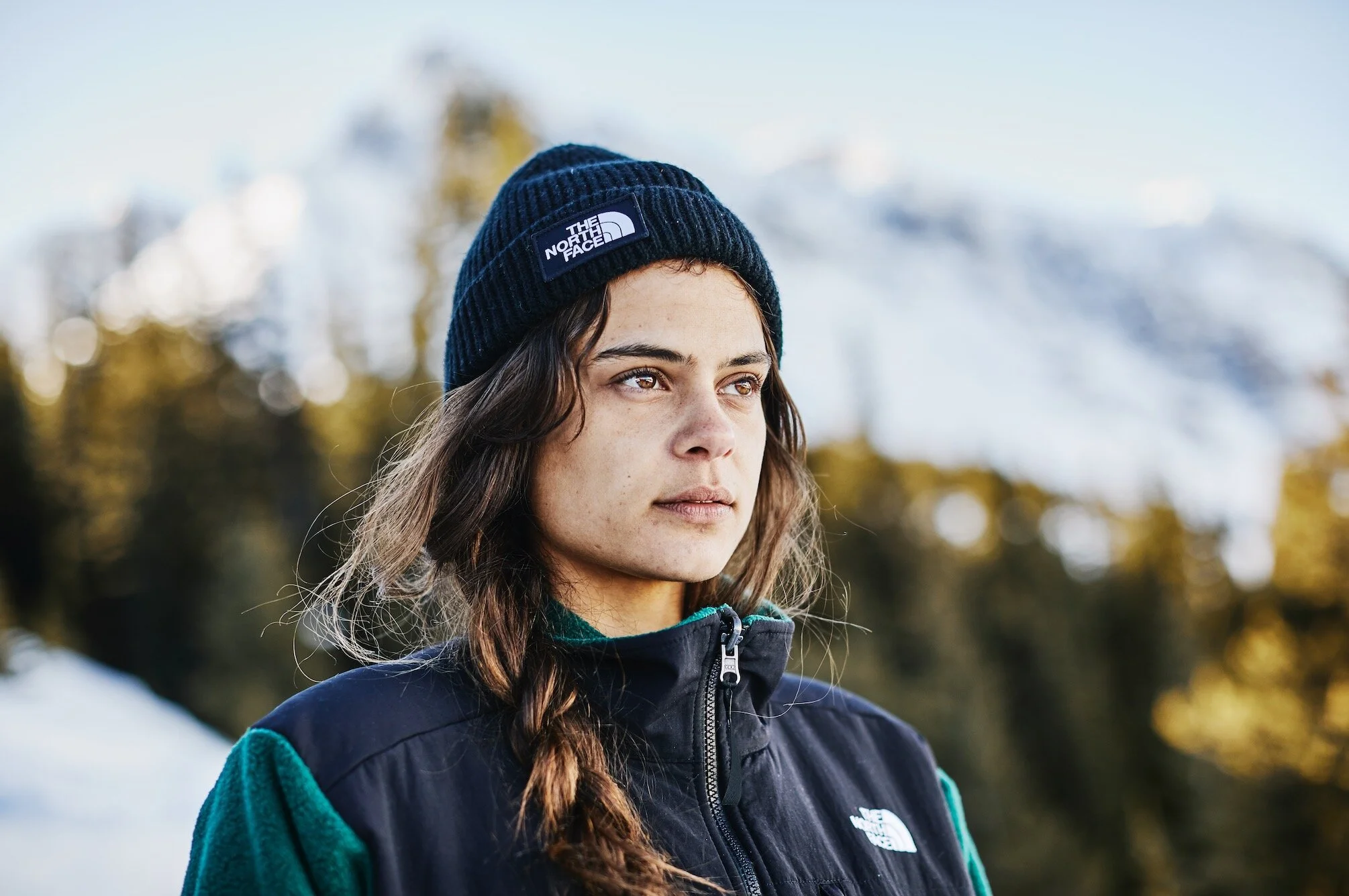 A cheerful person with curly blonde hair wearing reflective sunglasses and a bright yellow and black North Face winter jacket, standing in a snowy mountain landscape under a blue sky.